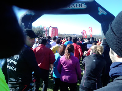 Después de recoger los dorsales nos fuimos a calentar, pero no a correr sino al coche con la calefacción a tope. Nos pusimos más capas que las cebollas y nos dirigimos a la salida con el tiempo justo. Allí en medio de los 1000 corredores, con un sol tímido, tampoco se estaba tan mal. Dieron la salida sin avisar, como empieza a ser constumbre en las carreras (digo yo que un micrófono para la cuenta atrás ...). Yo salí despacio por posibles lesiones (recuerdo que sólo calentamos en el coche), aún así hice el primer km en 4´07´´, no me lo podía creer. La razón era que iba detrás de Oscar y no nos molestaba nadie al correr (poquita gente).
